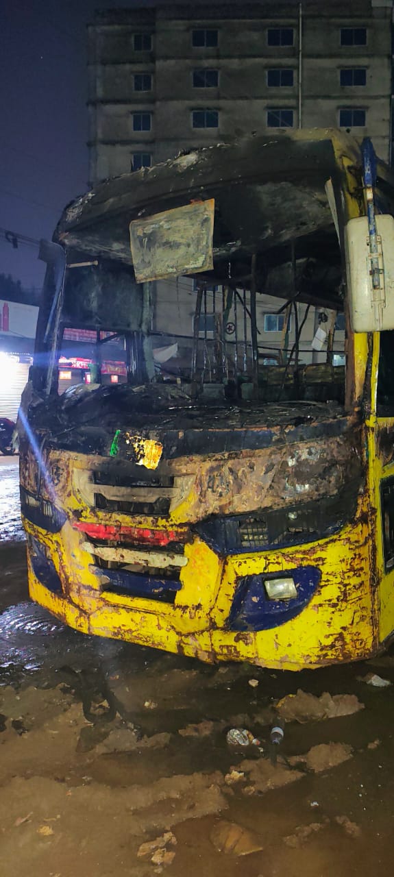 আশুলিয়ায় পার্কিং করে রাখা বাসে আগুন, গুলি বর্ষণ।
