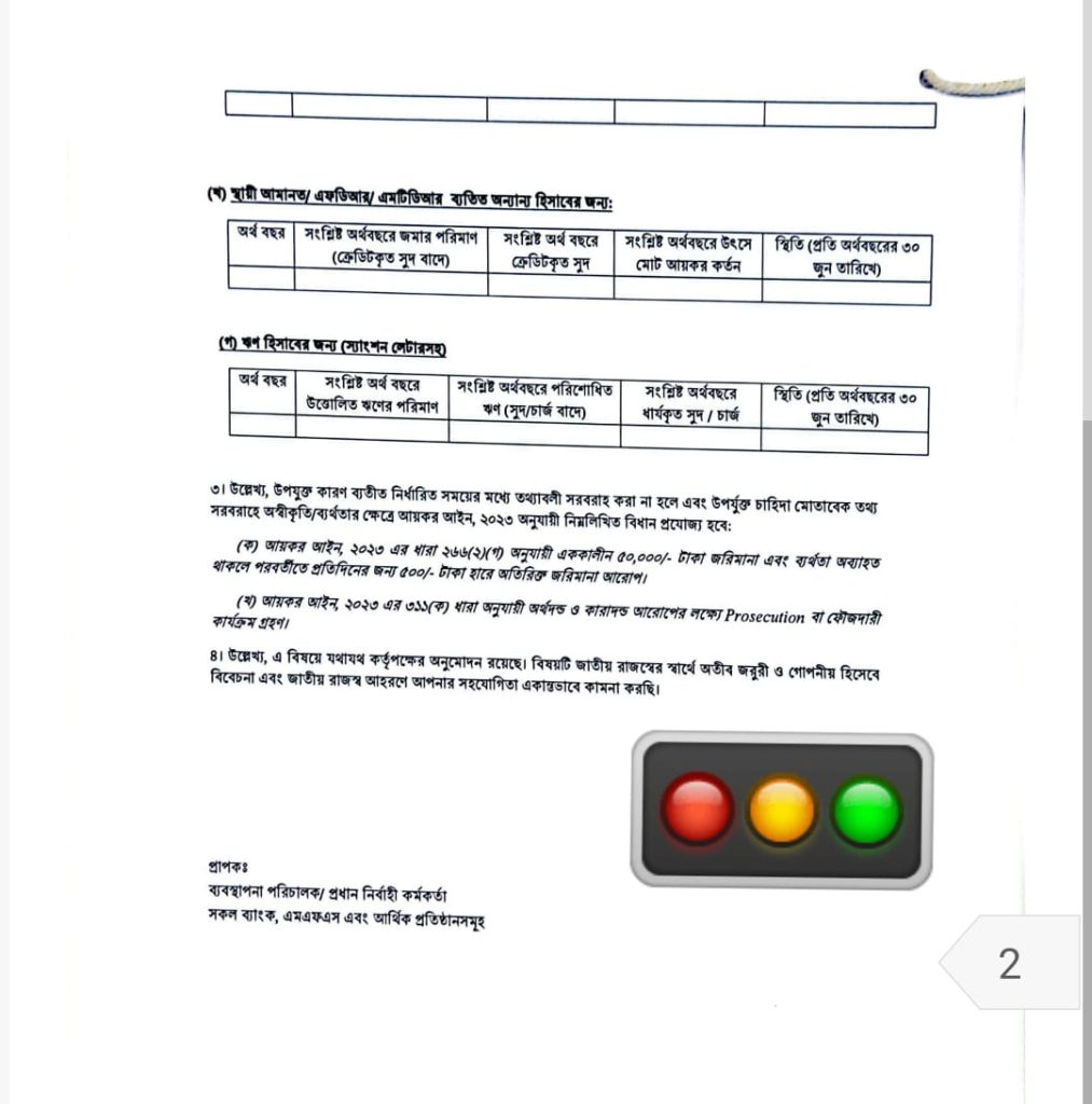 এছাড়া নির্ধারিত সময়ে তথ্য প্রদান না করলে আয়কর আইন, ২০২৩ এর ধারা ২৬৬(২)(গ) অনুযায়ী এককালীন ৫০ হাজার টাকা জরিমানা এবং পরবর্তী প্রতিদিনের জন্য অতিরিক্ত ৫০০ টাকা জরিমানার বিধান প্রযোজ্য হবে বলে উল্লেখ করা হয়েছে। একই সঙ্গে ধারা ৩১১(ক) অনুযায়ী অর্থদণ্ড ও কারাদণ্ডের লক্ষ্যে ফৌজদারি কার্যক্রম গ্রহণের কথাও জানানো হয়।